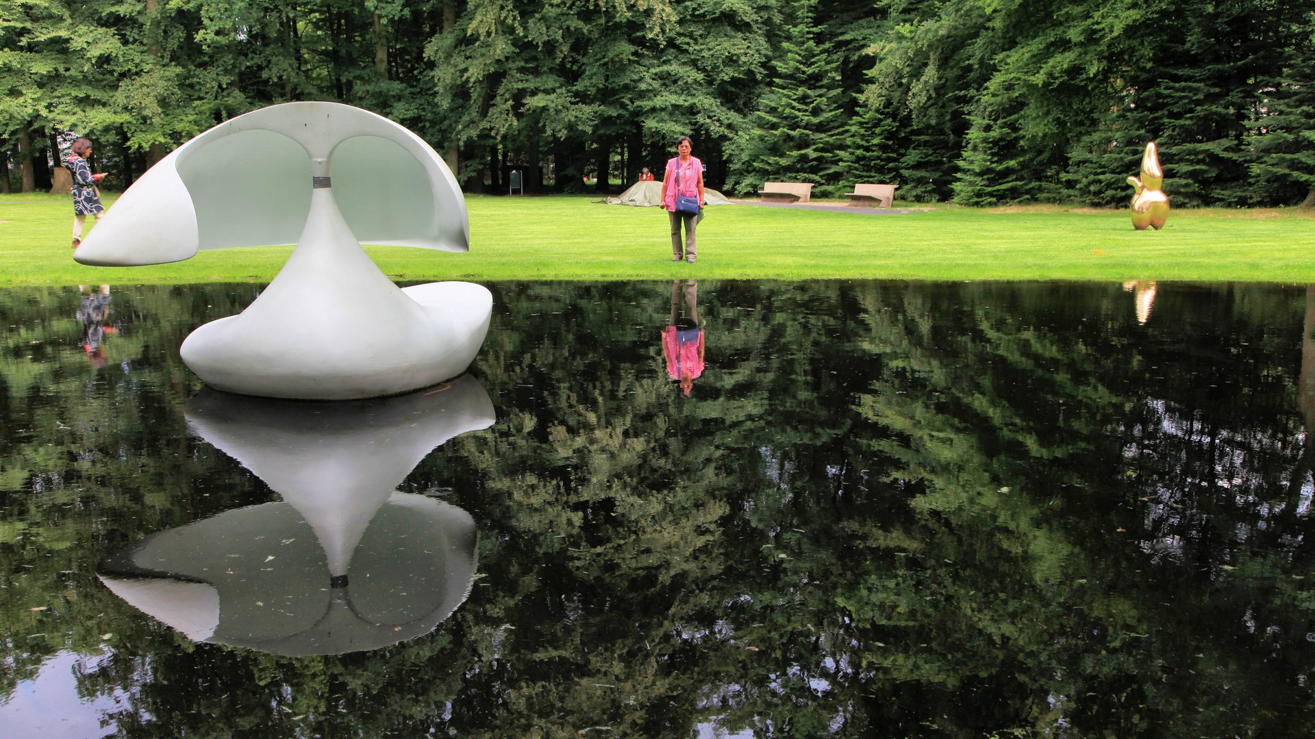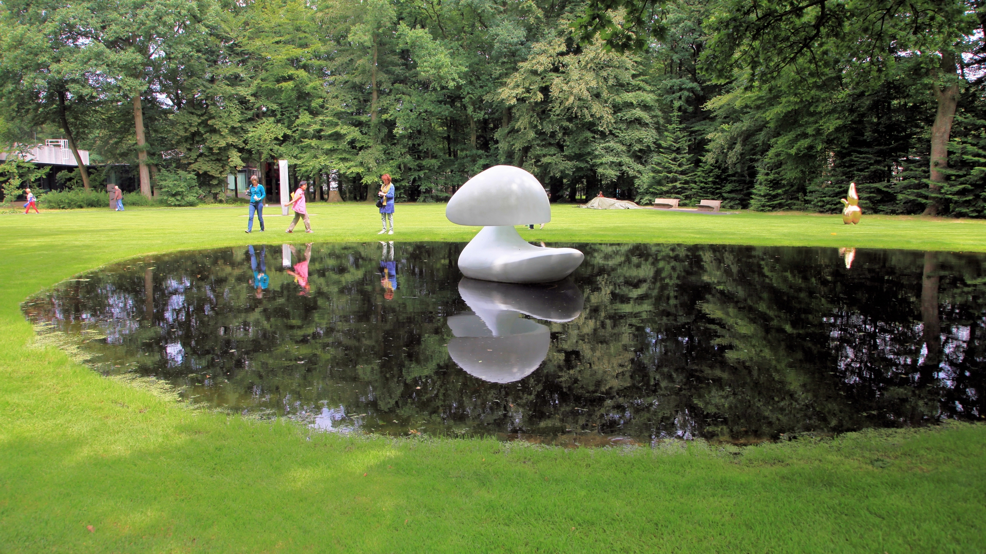 室外的雕塑公園有很多的雕塑,倒影很美,在 森林內騎腳踏車(免費,包含在門票內),很棒。